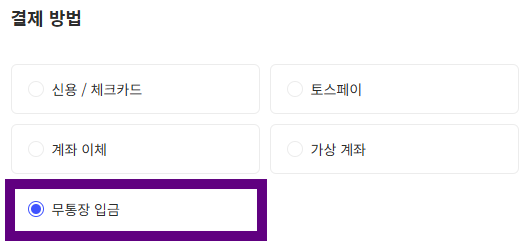 [무통장 입금] → 결제 수단에서 반드시 무통장 입금 선택 후